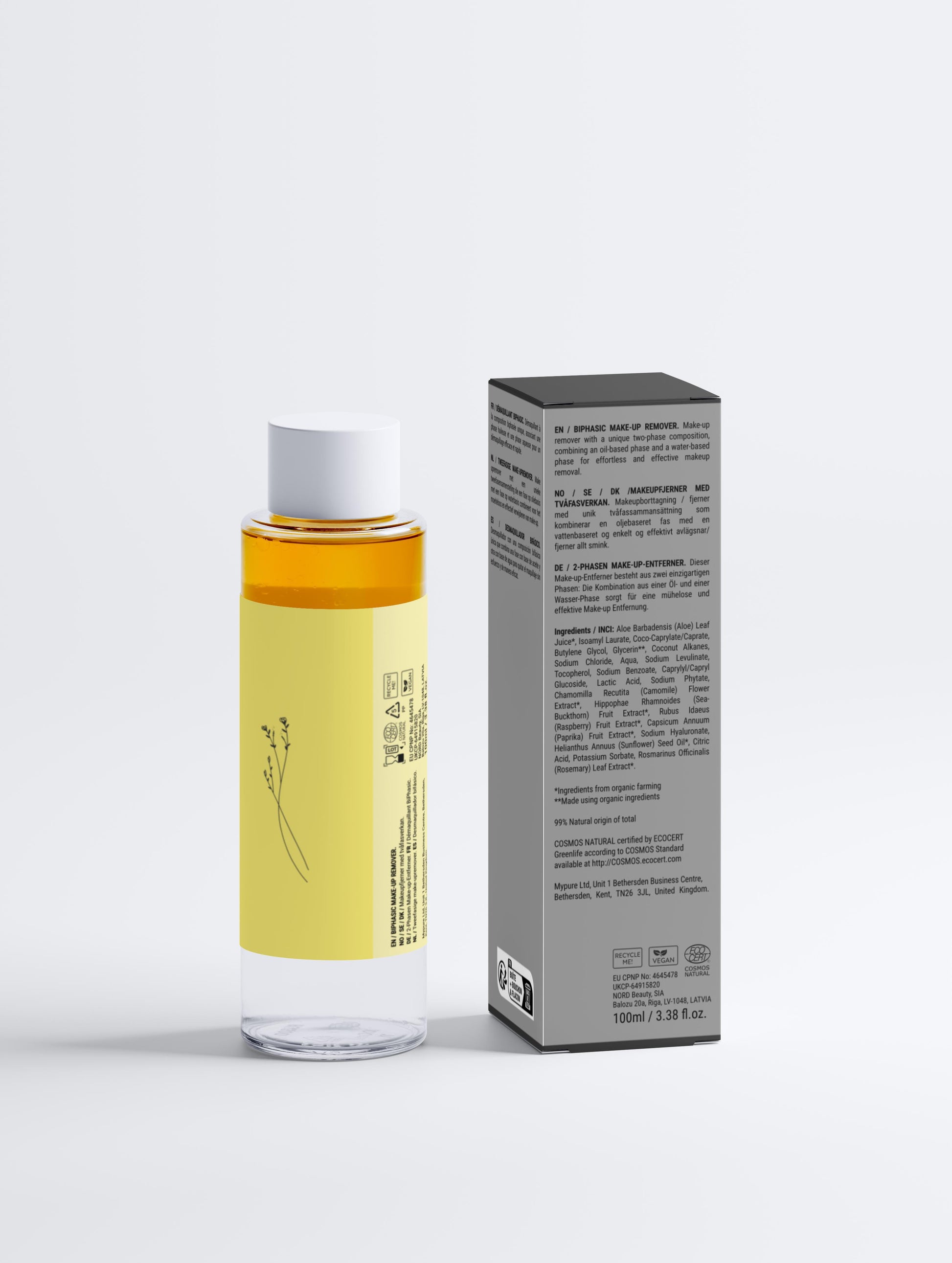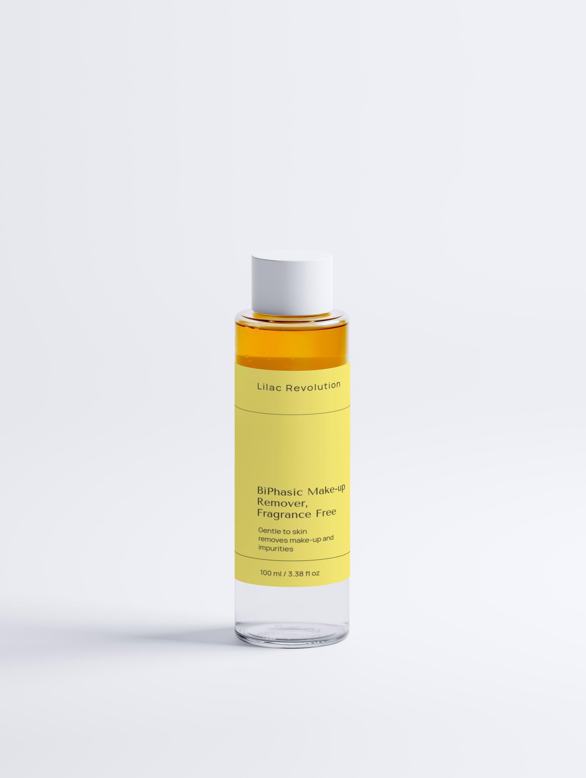 Product Description: Make-up remover with a unique two-phase composition, combining an oil-based phase and a water-based phase for effortless and effective makeup removal. This fragrance-free formulation gently cleanses, soothes, and leaves the skin feeling hydrated.
